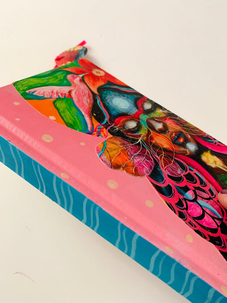 The front cover has print of the painting "Abundant Soil" with added mixed media details with paint and collage. Back cover has original painting and collage details. Spine has its own painting details & design.