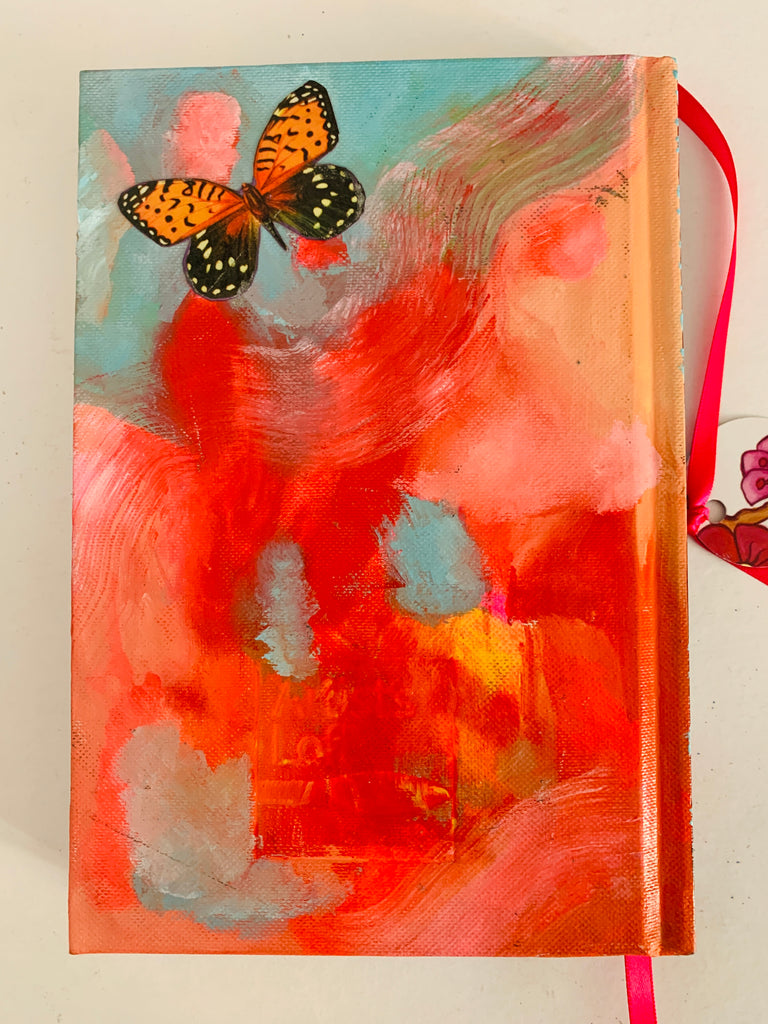 The front cover has print of the painting "Surrender" with added mixed media details with paint and collage. Back cover has original painting and collage details. Spine has its own painting details & design.