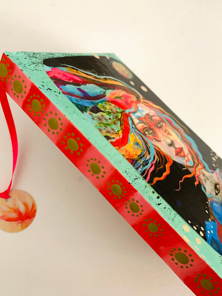 The front cover has print of the painting "Whale of Desire" with added mixed media details with paint and collage. Back cover has original painting and collage details. Spine has its own painting details & design.