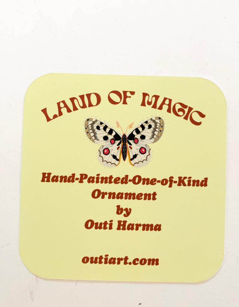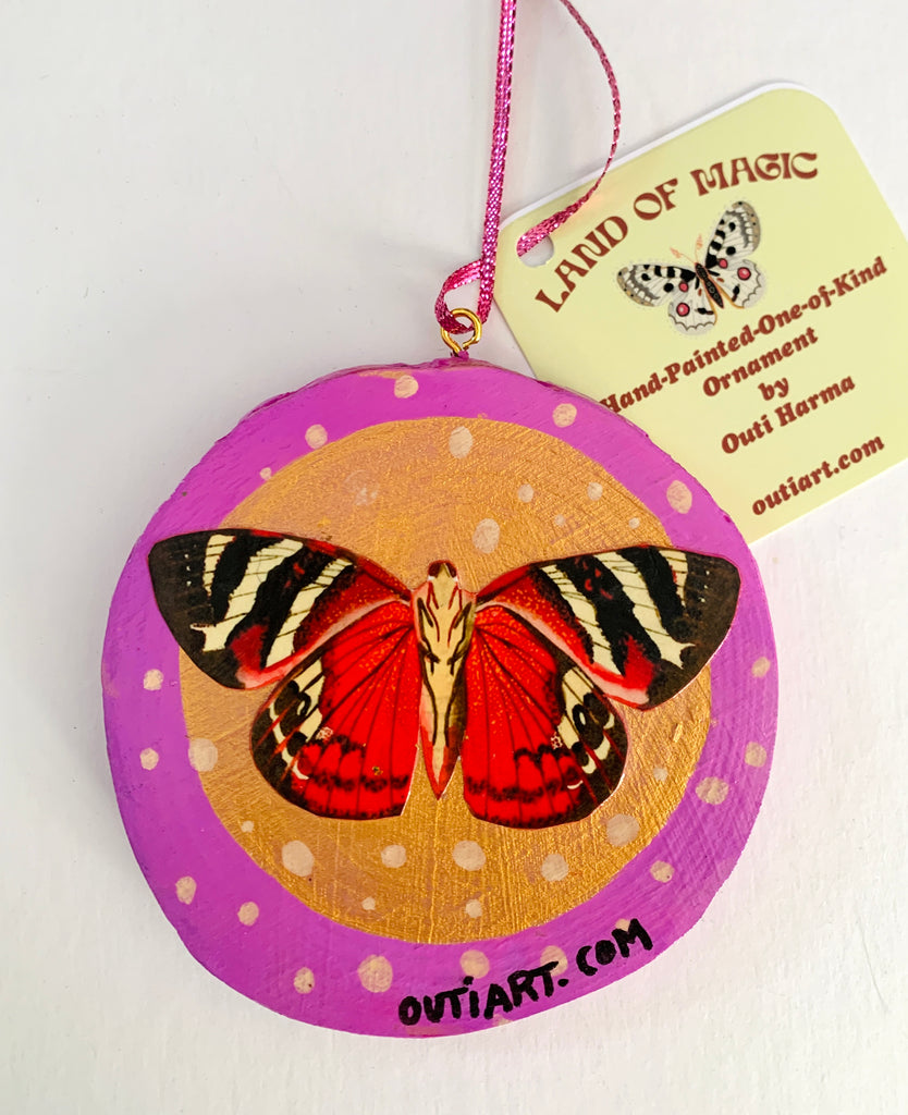 Original collage and Painting on 4” round wood with ribbon for hanging.