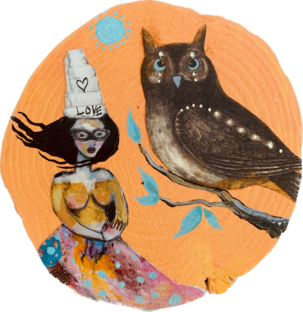 Original collage, mixed media mini painting on 4.5” round wood.